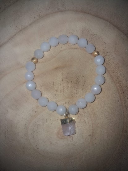 Zart, edel und voller Bedeutung: Dieses handgefertigte Einzelstück besteht aus 21 facettierten Rosenquarzperlen, die sanft das Licht einfangen und bei Bewegung weich reflektieren, ergänzt durch zwei goldene Zwischenperlen mit kleinen Rosenquarz-Rohsteinanhängern. Ein liebevoll gearbeitetes Schmuckstück, das Ruhe, Liebe und feminine Eleganz ausstrahlt – einzigartig in seiner Ausstrahlung und perfekt als besonderes Geschenk oder wertvoller Begleiter für dich selbst.