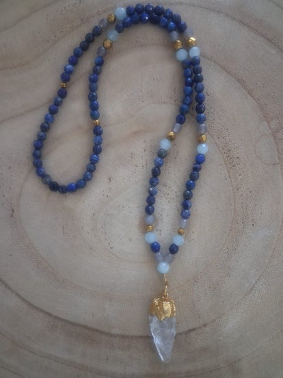 Diese handgefertigte Kette aus 108 sorgfältig ausgewählten Perlen vereint facettierten Lapislazuli, facettierten Aquamarin, graue facettierte Achatperlen und schimmernde goldene Hämatitperlen. Die facettierten Steine fangen das Licht elegant ein und verleihen dem Schmuckstück eine besondere Tiefe. Abgerundet wird das Design durch einen natürlichen Bergkristall-Rohsteinanhänger als kraftvolles Highlight. Eine harmonische, edle Kette mit beruhigender Ausstrahlung.